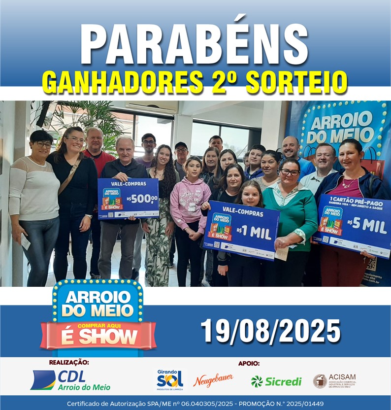 Na tarde desta sexta-feira, dia 22, na sede da CDL, o presidente Fábio Bruxel realizou a entrega dos prêmios do segundo sorteio da campanha “Arroio do Meio comprar aqui é Show”, realizado no dia 19 de agosto. A entrega contou ainda com a presença do prefeito Sidnei Eckert e do secretário da Indústria, Comércio e Turismo, Marcelo Schneiders.