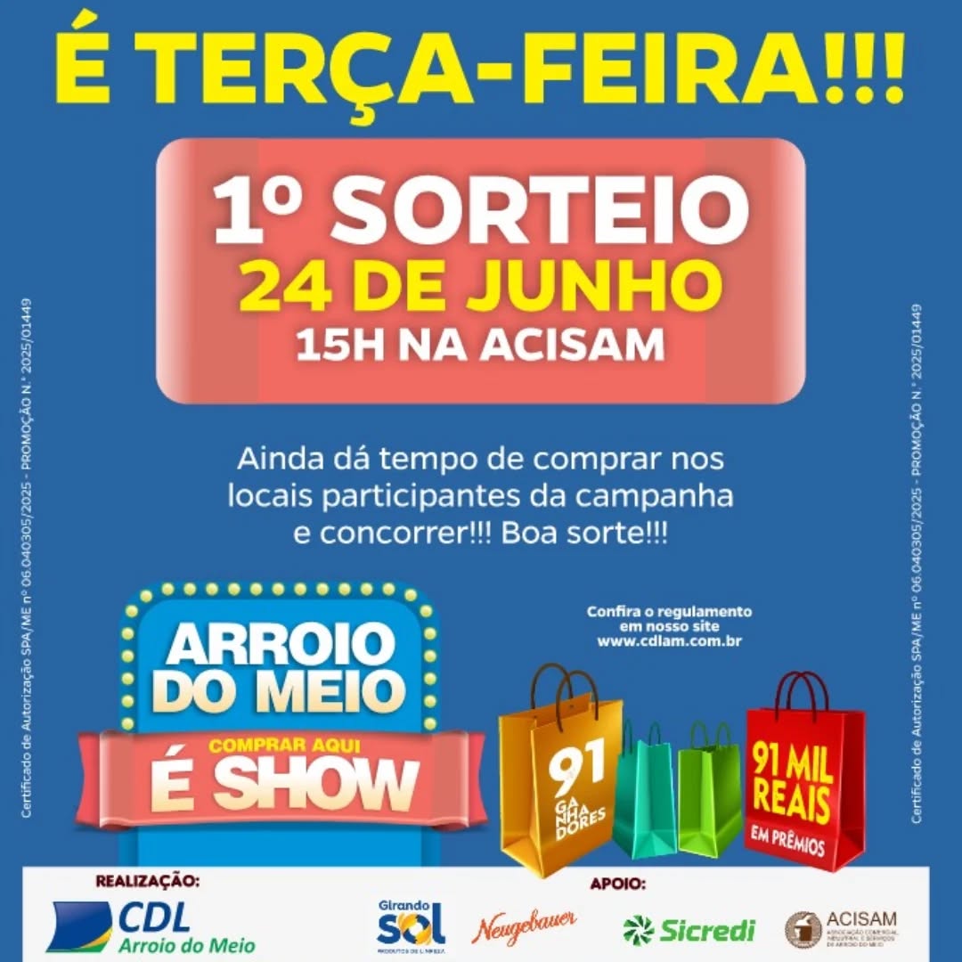 A campanha “Comprar Aqui é Show”, promovida pela CDL com apoio da Girando Sol, Neugebauer, Sicredi e ACISAM, realiza seu primeiro sorteio no dia 24, às 15h, na sede da Acisam. A cada R$ 100,00 em compras, mediante apresentação da Nota Fiscal ou Cupom Fiscal em empresas participantes da promoção, o consumidor tem direito a um cupom, com limite de 20 cupons por compra.
