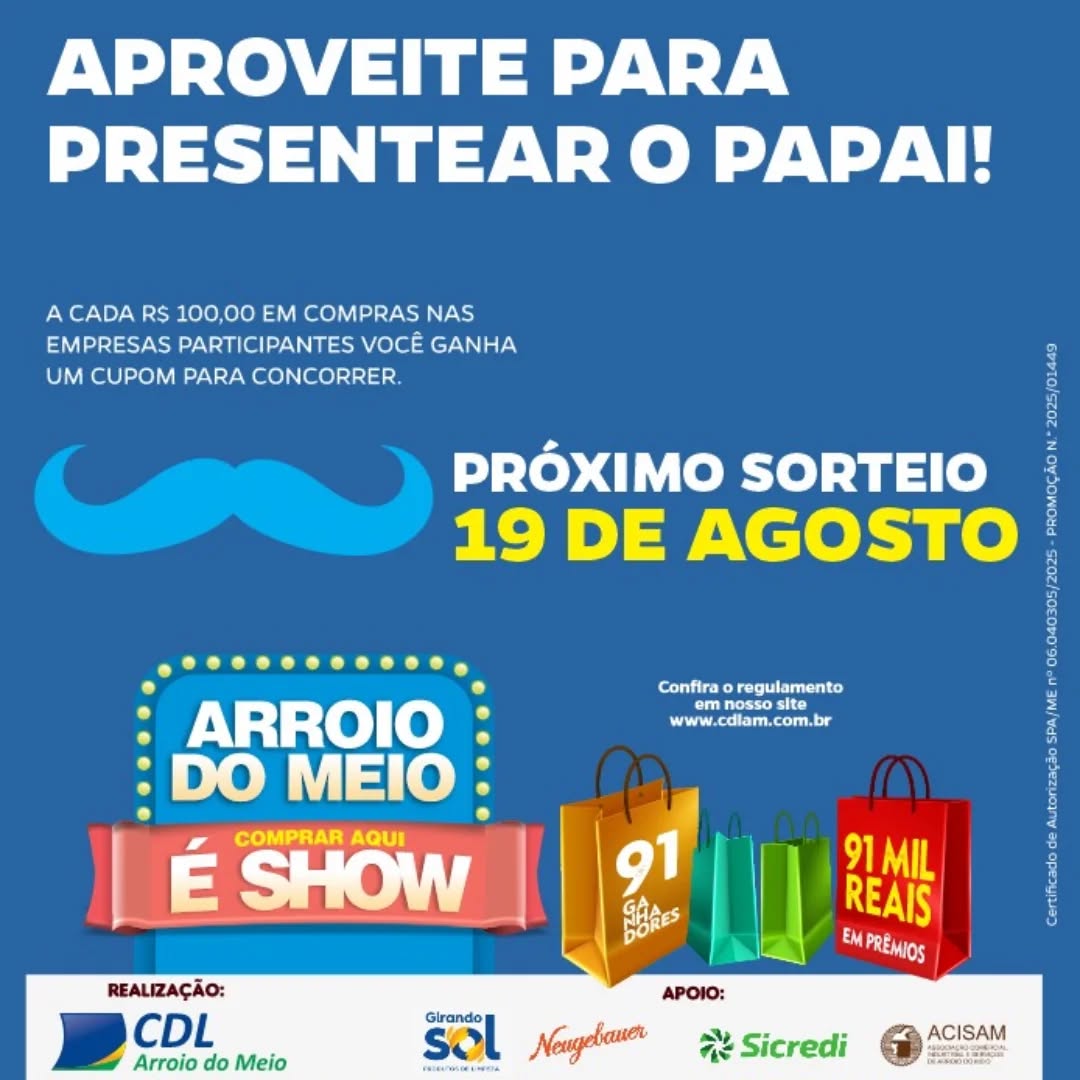 A campanha “Comprar Aqui é Show”, promovida pela CDL com apoio da Girando Sol, Neugebauer, Sicredi e ACISAM, realiza seu segundo sorteio no dia 19, na sede da ACISAM. A cada R$ 100,00 em compras, mediante apresentação da Nota Fiscal ou Cupom Fiscal em empresas participantes da promoção, o consumidor tem direito a um cupom, com limite de 20 cupons por compra.