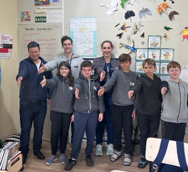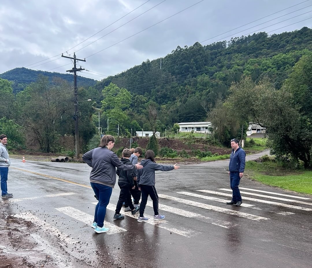 A Cooperativa Vale Log está integrada às ações. A colaboradora Cláudia Rauber, ao lado do instrutor Luiz Fernando Foletto, ambos representando o MOV.IT, estiveram reunidos com os alunos da Escola Municipal de Ensino Fundamental Afonso Celso, de Picada Arroio do Meio, em uma atividade prática e teórica sobre a importância da faixa de pedestres.