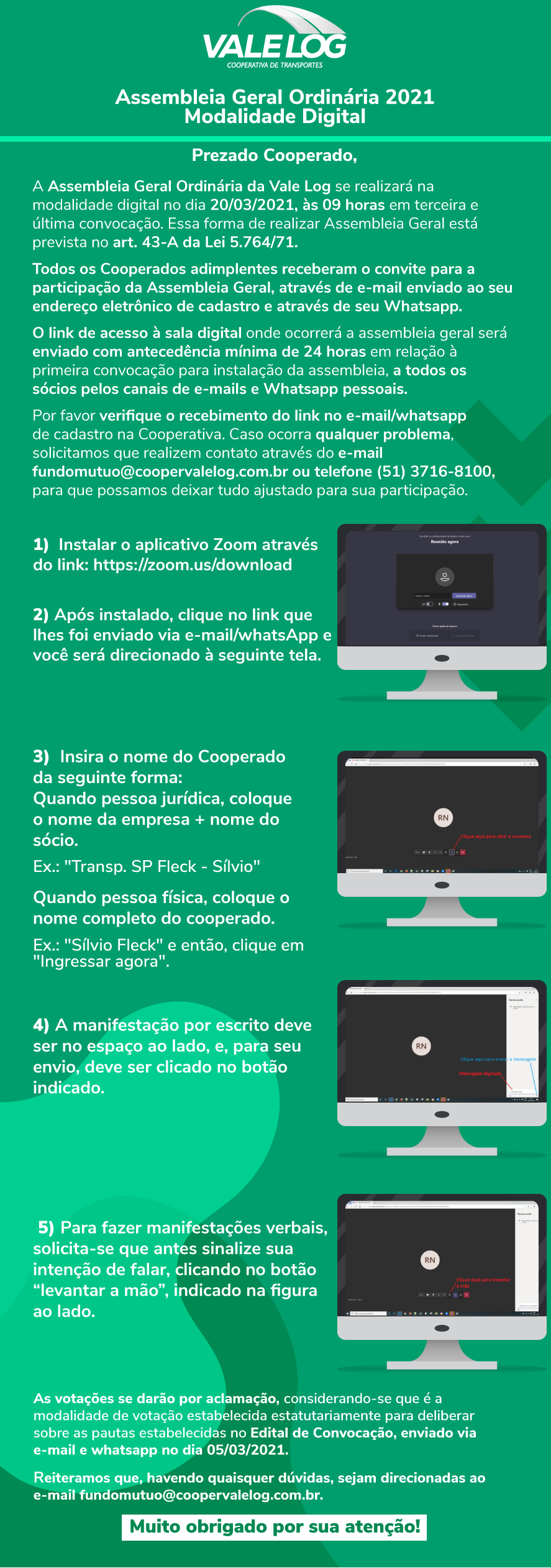 Pela primeira vez, a Vale Log realizará sua Assembleia Geral Ordinária na modalidade digital. A reunião, agendada para o dia 20/03, às 09h em última chamada, será realizada de forma totalmente virtual por meio do aplicativo Zoom. Todos os cooperados adimplentes poderão participar.